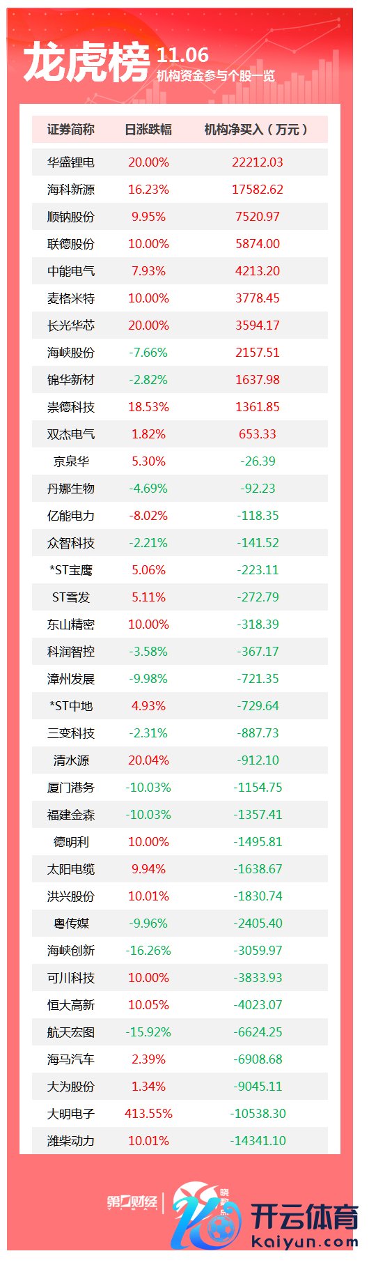 当天机构净买入前三的股票区别是华盛锂电、海科新源、顺钠股份,净买入金额区别是2.22亿元、1.76亿元、7521万元。