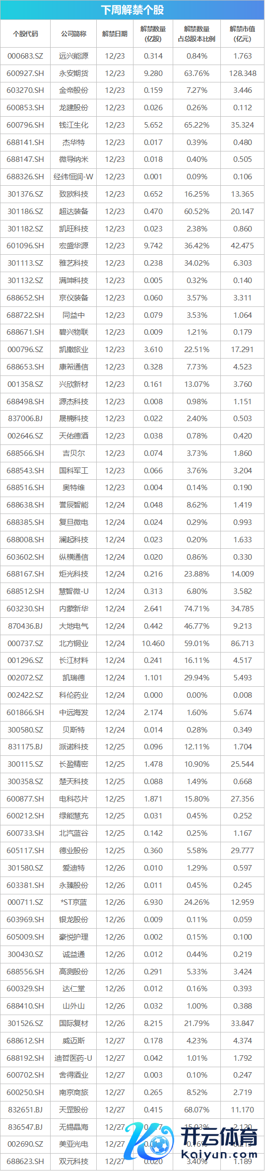 Wind数据统计表示,下周(12月23日-12月29日)共有逾60家公司限售股持续解禁,按照最新收盘价策画,共计解禁市值达622.07亿元。
