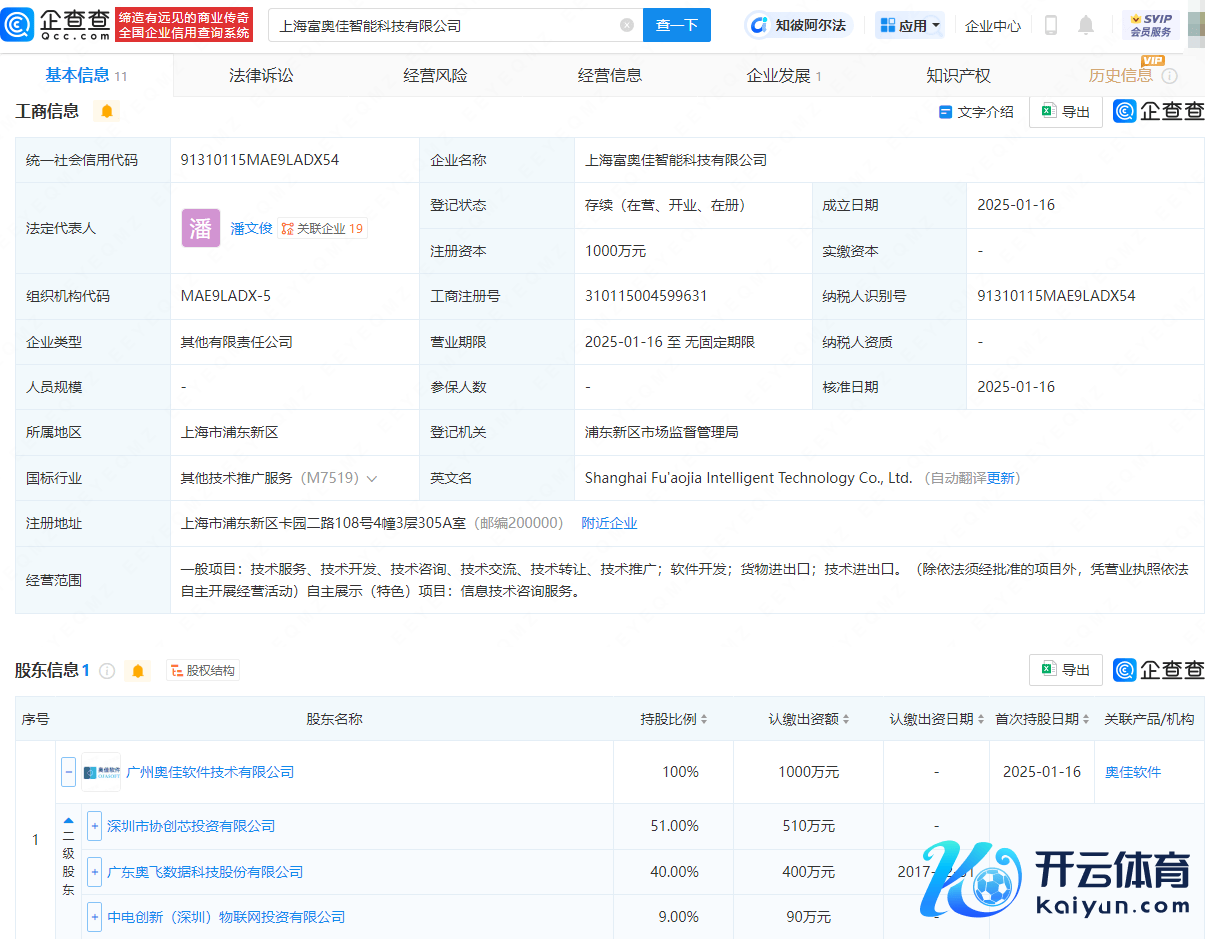 企查查APP露馅,近日,上海富奥佳智能科技有限公司开导,法定代表东说念主为潘文俊,注册老本为1000万元,目的领域包含:软件开发;货品收支口;本领收支口;信息本领商榷工作等。企查查股权穿知道馅,该公司由广州奥佳软件本领有限公司全资捏股,后者由深圳市协创芯投资有限公司、奥飞数据(300738)等共同捏股。 【免责声明】本文仅代表作家本东说念主不雅点,与和讯网无关。和讯网站对文中述说、不雅点判断保捏中立,分辨所包含践诺的准确性、可靠性或完好性提供任何昭示或示意的保证。请读者仅作参考开云网站,并请自