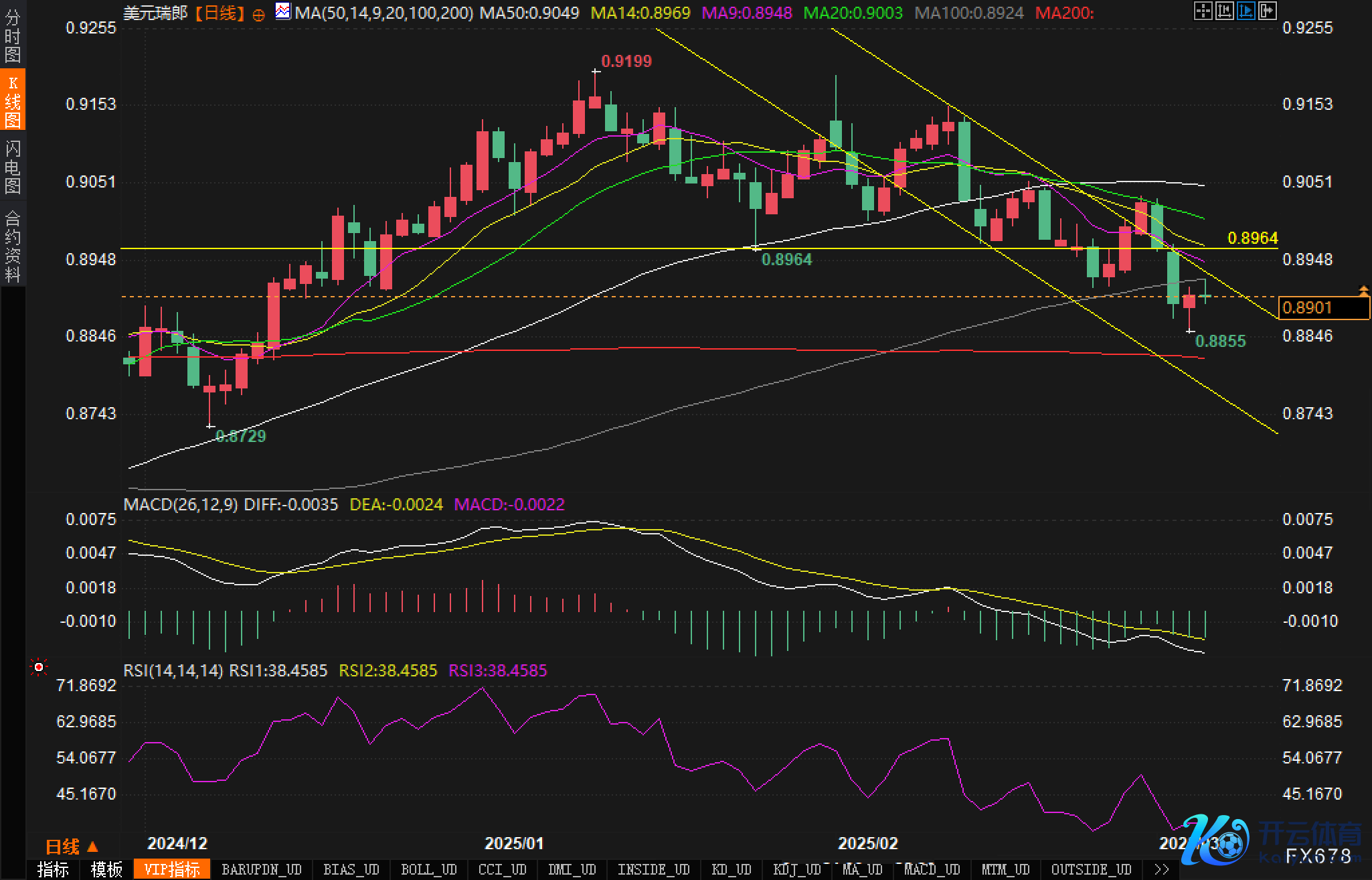 好意思元/瑞郎往常几个月的下行趋势特殊彰着,从2024年12月于今的走势图不错看出,价钱仍是从0.9199的高点握续下滑。固然短期内可能出刻下候性反弹,但要说明中期趋势逆转,还需要价钱重新站上MA50和MA100均线。