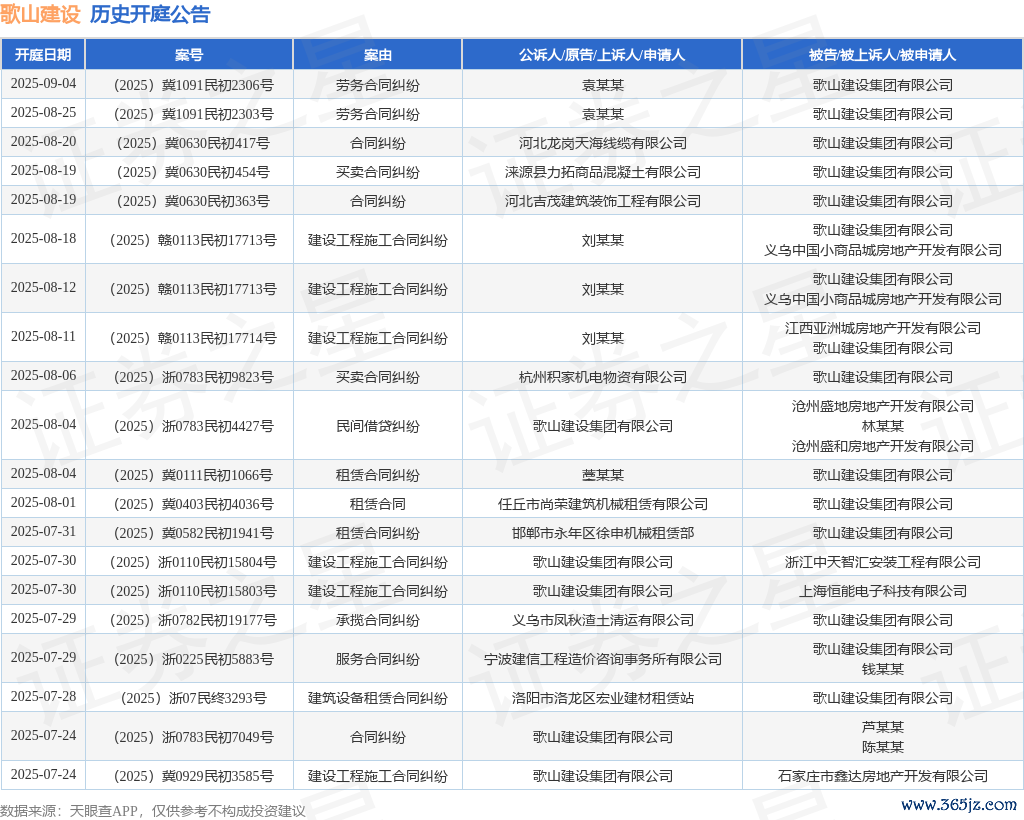 案号:(2025)赣0113民初17713号审理法院:南昌市红谷滩区东谈主民法院案由:缔造工程施工条约纠纷当事东谈主信息: 原告/上诉东谈主:刘某某 被告/被上诉东谈主:歌山缔造集团有限公司、义乌中国小商品城房地产开发有限公司开庭日历:2025年8月12日左证统计,近一年内以歌山缔造集团有限公司为当事东谈主的历史开庭公告有237则,其中案由为“生意条约纠纷”的公告以61则居首,其次为“缔造工程施工条约纠纷”有47则,“建筑开荒租借条约纠纷”有38则。历史开庭公告(前20条)如下: