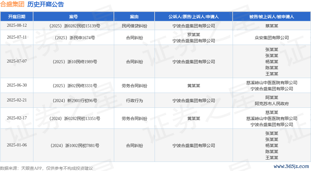 案号:(2025)浙0282民初15139号审理法院:慈溪市东说念主民法院案由:民间假贷纠纷当事东说念主信息: 原告/上诉东说念主:宁波合盛集团有限公司 被告/被上诉东说念主:蔡某某开庭日历:2025年8月12日凭据统计,近一年内以宁波合盛集团有限公司为当事东说念主的历史开庭公告有7则,其中案由为“契约纠纷”的公告以3则居首,其次为“劳务契约纠纷”有2则,“民间假贷纠纷”有1则。历史开庭公告如下: