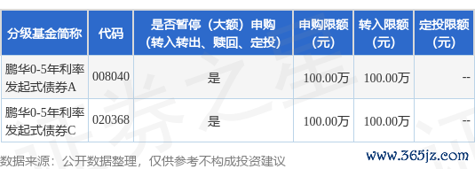 本站音问,8月15日鹏华基金贬责有限公司发布《鹏华0-5年利率债债券型发起式证券投资基金C类基金份额暂停大额申购、调治转入和依期定额投资业务的公告》。公告中指示,为保护基金份额合手有东谈主利益,自2025年8月18日起鹏华0-5年利率债债券型发起式证券投资基金C类基金份额暂停大额申购、调治转入和依期定额投资业务,下属分级基金调整明细如下: