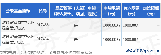 本站音书,8月15日财通证券钞票科罚有限公司发布《财通资管数字经济夹杂型发起式证券投资基金暂停大额申购、诊疗转入、如期定额投资业务公告》。公告中教唆,为难得财通资管数字经济夹杂型发起式证券投资基金的厚实运作,保护基金份额握有东谈主的利益开yun体育网,自2025年8月18日起财通资管数字经济夹杂型发起式证券投资基金暂停大额申购、诊疗转入、如期定额投资业务,申购、诊疗转入上限金额为1000.0万元,下属分级基金诊疗明细如下:
