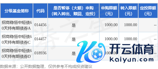 本站音尘开云体育,9月24日招商基金照管有限公司发布《对于调节招商稳恒中短债60天捏有期债券型证券投资基金A类份额、D类份额大额申购(含如期定额投资)和调节转入业务的公告》。公告中教唆,为保险基金的沉着运作,留意基金份额捏有东说念主利益,自2025年9月30日起调节招商稳恒中短债60天捏有期债券型证券投资基金A类份额、D类份额大额申购(含如期定额投资)和调节转入业务,申购、调节转入上限金额为0.1万元,下属分级基金调节明细如下: